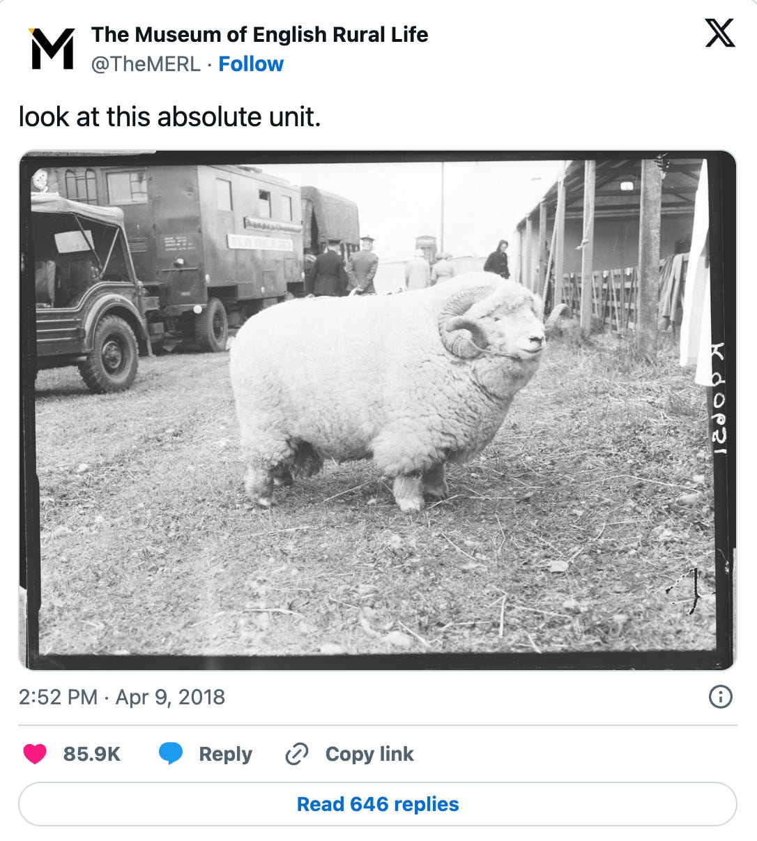 In 2018, a member of our curatorial team Adam Koszary tweeted a photo from our collection (of a very large sheep) with a trending meme caption: ‘look at this absolute unit’. The tweet blew up instantly and our world changed forever.